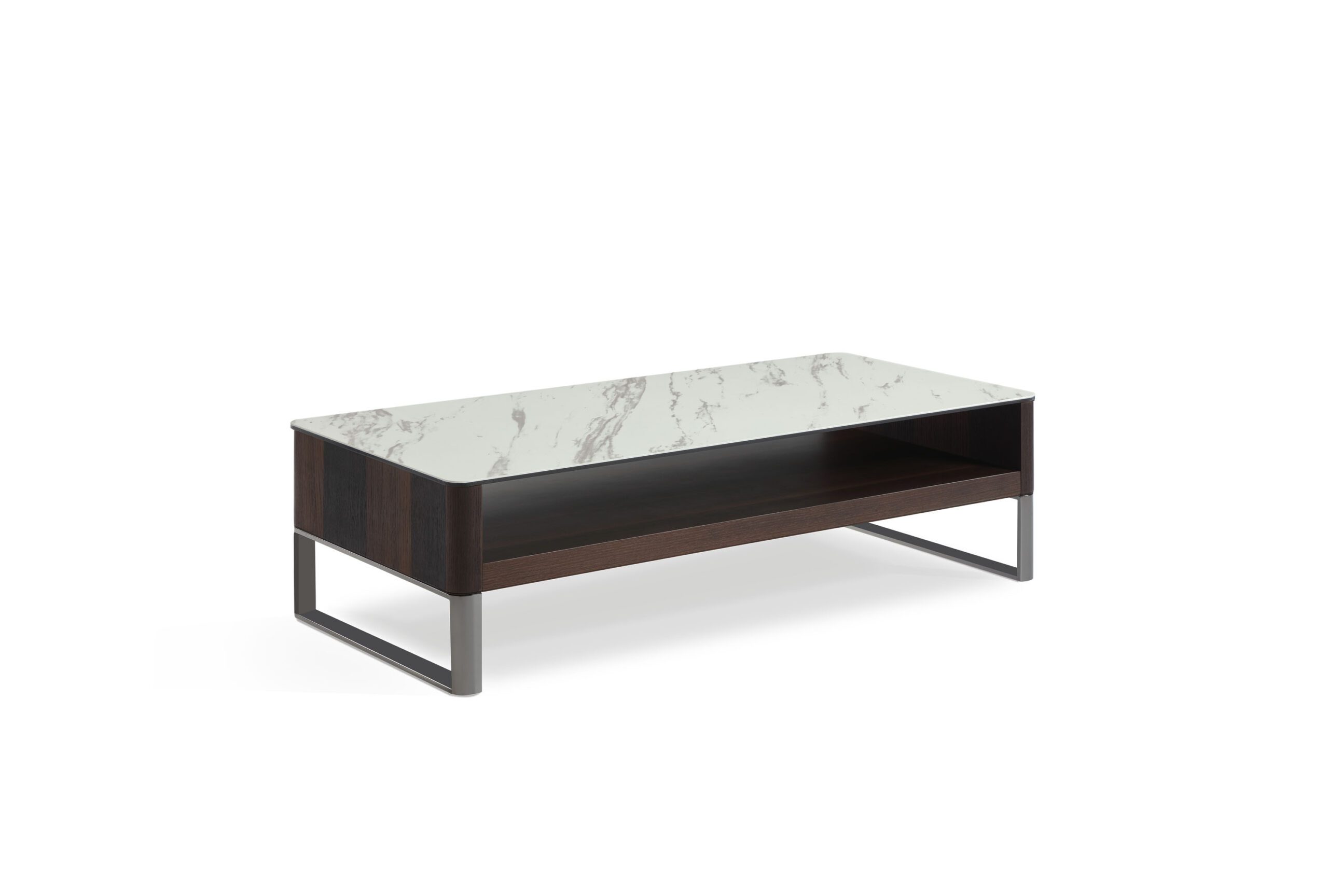 Mesa de centro con top de cerámica italiana, base en chapa color Smoked Oak y patas en acabado Shiny.Dimensiones: 1.30 × 0.60 × 0.385 m