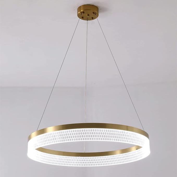 Lámpara de techo con luz LED de 60W, fabricada en aluminio. Color: dorado y acrílico transparente con diseño a cuadros. Dimensiones: diámetro de 1.00 m y altura del aro de 8 cm. Abito / Color: GOLD