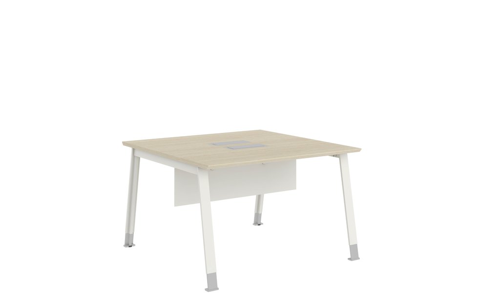 Estación de trabajo lineal para 2 personas con top de melamina y patas de acero en forma de A.Incluye: Tapa abatible en el top, Faldón.No Incluye: Mampara y Soporte para cablesDimensiones: 1.20×1.20×0.75mts Color: CF01
